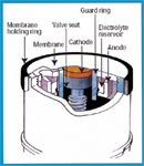 EC sensors apply the polarographic principle of electrochemistry. The electrochemical cell consists of two or three electrodes, a cathode, an anode, and possibly a guard-ring electrode submersed in a electrolyte (see Figure 2). These parts are covered by a gas-permeable membrane. A specific potential is applied to the cathode that will selectively reduce the gas analyte of interest. Essentially, the membrane separates the gas from the liquid according to the principles of Henry's Law, which asserts that gases seek to be balanced across a permeable barrier (5). Because the cathode chemically changes the gas, the effective concentration in the electrolyte always remains zero, thus keeping a constant permeation of gas into the cell. The current generated by the reduction of ozone at the cathode is proportional to the concentration of the ozone outside the cell. Adjusting for temperature and solubility yields a dissolved value.
