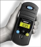 Several commercially available kits have taken the laboratory-based indigo method and adapted it so that it can be used in a process environment (11). The kit incorporates a known amount of indigo titrant dried on the inside of a sealed and evacuated clear glass ampul. The ampul can then be placed in a flowing sample stream and cracked (see Figure 7). The water is sucked into the ampul by the vacuum, comes in contact with the indigo, and turns the water blue. The dissolved ozone consumes a portion of the indigo and lightens the color. The ampul can then be inserted into a spectrophotometer (see Figure 8) to quantify the color change. This kit has become the de facto standard for dissolved ozone analyzer verifications in the industry. Its accuracy is specified at ±0.01 mg/L (10 ppb). Of course, the same precautions taken with the indigo method should be observed here. Whether using the actual titration apparatus or the commercial kit, the analyzer value then is compared with value obtained from the indigo method. If it is within the combined margin of error (typically ±0.02 mg/L), then it is considered verified.
