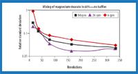 Fill level. Fill level can lead to the most striking differences in mixing performance (see Figure 1). The mixing process is the slowest, and the homogeneity of magnesium stearate is the poorest, at the highest fill level (85%). Hindered mixing, often observed at a high fill level, produces a slow homogenization of magnesium stearate. Even though long mixing times can compensate for the slow mixing conditions of a high fill level, this step is often a poor solution: in a scaled-up operation, long mixing times will almost certainly result in overlubrication.