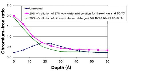The quality of the passive layer can be assessed through various methods, including X-ray photoelectron spectroscopy (XPS). XPS commonly helps scientists validate chemical treatments. Before passivation, operators rinse mechanically polished stainless-steel panels with isopropyl alcohol, high-purity water, acetone, and again with high purity water. After passivation treatment, operators remove the panels, rinse them with high-purity water, and allow them to air dry. Figure 1 shows the results of an XPS analysis (5, 6). The chromium–iron ratio at the surface of the untreated sample is approximately 0.25 Å, while that of the samples treated with formulated or commodity citric acid is approximately 2.0 Å.