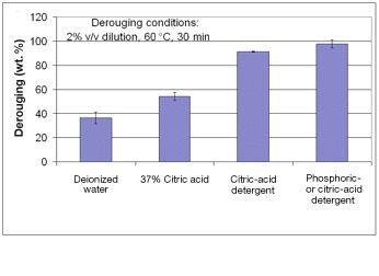 The author generated laboratory rouge by suspending a preweighed 304 stainless-steel coupon and mild steel coupon in a 1% sodium-chloride solution while mixing for one week. The laboratory-generated rouged coupons were then treated with water, citric acid, formulated citric acid, or phosphoric-acid detergent at 60 °C for 30 min. The results, shown in Figure 3, indicate that low-level concentration and temperature conditions can remove rouge.
