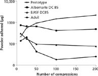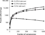 Effect of ibuprofen loading on sticking. To investigate the sensitivity of the method to various concentrations of a sticky component, different levels of ibuprofen were mixed into a blend containing microcrystalline cellulose and 0.25% magnesium stearate. Figure 3 shows that the sticking propensity and the powder accumulated on the punch tips during the first 100 compressions tested increased with increasing ibuprofen concentrations. The quantitative measurements of accumulated powder were supported by visual inspection of punch tips, which showed high degrees of surface coverage at high ibuprofen concentrations. After approximately 100 compressions, the weight of adhered powder sometimes decreased suddenly or gradually. The sudden decreases in weight were attributed to the detachment of large domains of adhered powder from the punch tip after further compressions. The gradual decreases were attributed to a steady wearing of the film from the punch tip. These results highlight the unpredictable sticking behavior of suboptimal formulations containing high levels of sticky components and emphasize the potential for challenging manufacturing performance.