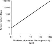 The authors aimed to design and test a custom tableting punch with a removable tip that would allow users to quantitatively assess material sticking to tooling surfaces by weighing the adhered powder. This approach for measuring the adhered powder has not been put into practice because of the practical difficulties inherent in accurately measuring an extremely small quantity of adhered powder (i.e., micrograms) on a punch that weighs ~100 g. Therefore, a removable punch tip with a low mass (i.e., < 5 g) that can be weighed on a microbalance solves this problem. A simple calculation of the weight of powder adhered to a 12.7-mm diameter flat-faced punch tip suggests that a uniform film thickness as thin as 0.1 µm can be detected using a microbalance, assuming a sample true density of 1.5 g/cc (see Figure 1). This limit of detection is reasonable because the particle diameters of most pharmaceutical powders are greater than 1 µm. In this study, a custom-designed punch with a removable tip was assessed as a method for quantitatively evaluating punch-sticking behavior of formulations containing various concentrations of sticky powders in tablet formulations.