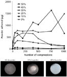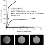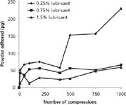 Effect of mannitol grade on sticking. The sticking assessment method was also tested to determine whether sticking propensity could be detected using various grades of a single component. Figure 6 shows that after ~10 compressions, the powdered mannitol was about twice as sticky as granular mannitol. As expected, the microcrystalline cellulose did not stick to the punch surface. The higher sticking propensity of the powdered mannitol was hypothesized to result from its higher specific surface area, which increased its bonding potential to itself and the punch surface. A high number of compressions was not investigated with this method because of severe die-wall friction with the unlubricated powders. Mixing the granular mannitol at 75% w/w with microcrystalline cellulose, then further decreasing its concentration to 50% w/w and adding 1% w/w magnesium stearate significantly decreased the sticking propensity of the blend. This result demonstrates that the punch-sticking detection method can guide formulators when they optimize tableting-blend compositions and before progressing to large-scale manufacturing.