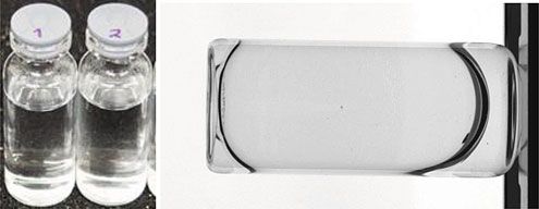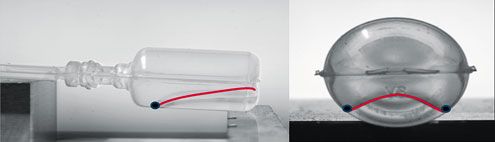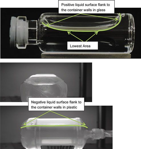 Figure 2: A glass container (top) has a positive liquid surface flank, which improves the probability of detecting floating particles. A plastic container (bottom) has a negative liquid surface flank, which creates a large probability of particles trapped at the side wall that cannot be detected.