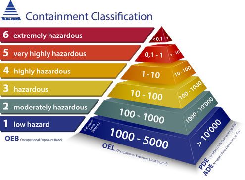 Figure 1. The containment classification pyramid compares occupational exposure limit (OEL), occupational exposure band (OEB), permitted daily exposure (PDE), and accepted daily exposure (ADE). ADCs require OELs of <0.1 μg/ m3. Images are courtesy of the author.