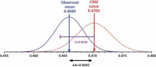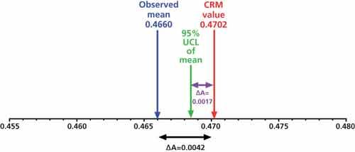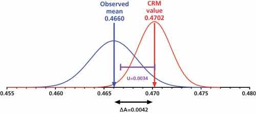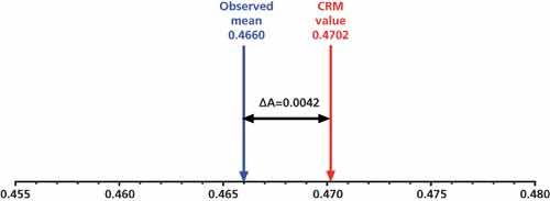 From these six data measurements, a mean value of 0.4660 is derived. From the certificate of the CRM, the certified value is given as 0.4702. There is, therefore, a difference between the measured mean value and the certified value of 0.0042 absorbance units as illustrated in Figure 1.