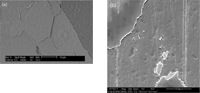 Figure 1: Scanning electron micrographs that show evidence of glassâliquid interaction, including a) a vial interior that has undergone delamination and shows signs of aggressive attack, and b) signs of modest glass-liquid interaction. No visible flakes were ever observed in the liquid. (ALL FIGURES ARE COURTESY OF THE AUTHOR)