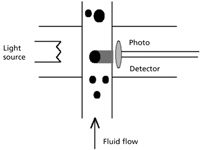 A consideration of the principle of operation for light obscuration can yield insight into this question. Figure 3 illustrates the operating principle behind light obscuration. Single particles are presented in front of a light source and are detected either by their color or by their geometry. Certain shapes cause internal reflection and make the object appear dark. The latter scenario is best illustrated by glass spheres. Soda lime glass (e.g., window glass), when in the form of a plate, does not obscure light. As a sphere, however, it reflects light internally and appears to be dark. Thus, window glass can be detected. For platelike or flakelike particles, light will be transmitted, not obscured. The only opportunity to detect a flakelike particle is when the edges of the particle can be detected.