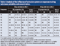 Table I: Analysis of the influence of extrusion system on responses to drug substance solubility and concentration.