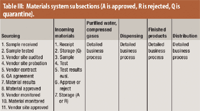 Table III: Materials system subsections (A is approved, R is rejected, Q is quarantine).
