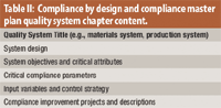 Table II: Compliance by design and compliance master plan quality system chapter content.