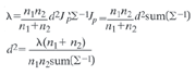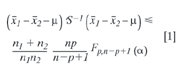 Suppose xij;Np(mj,S), j 5 1,2 and i = 1,2 . . . n are two independent multivariate normal dissolution profiles, one being a reference batch or a prechange batch and the other being a test batch or a postchange batch. Samples were taken at p different time points; n is the number of vessels, either 6 or 12, which is typical for tablet dissolution for a pharmaceutical product. The dissolution time points (p) for both profiles should be the same. Let ¯x1, ¯x2 be the vector of the sample mean for each of the profiles; S is the sample variance -- covariance matrix, and n1, n2 are the number of tablets tested from each batch. To define a closeness of the two dissolution profiles, (12a) 100% confidence region for m