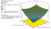In the next equation, R2 is 0.9881, adjusted R2 is 0.9842, and adequate precision is 56.625. The R2 of 0.9881 is in reasonable agreement with the adjusted R2 of 0.9842. The adequate precision ratio of 56.625 indicates an adequate signal, so the following model, in terms of coded factors, can be used to establish the design space: