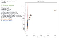 Hardness response. Two responses, tablet hardness and tablet weight, were measured throughout the set of experiments. Each measure response was analyzed individually. Using Design-Expert software, a half-normal plot of the experimental data results was constructed from the original screening results. The half-normal plot for the tablet hardness is shown in Figure 1. Only the significant factors are identified in the half-normal plot. After the sample tablets were pulled from the rotary tablet press, the tablets were left stationary for 2 min before being tested, according to the standard protocol, as previously described. During a formal campaign, the finished batch may be held for at least 24 h before being sampled and tested again. The purpose of the delay is to ensure that the tablets did not rebound because of the compressed material's elasticity. Elastic tablets tend to expand after compression, thus causing a decrease in measured tablet hardness.