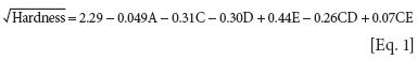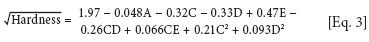 The software produces equations that show how the hardness will respond when any of the factors in the equation change. R2 measures the confidence that the hardness will be what is expected. Adjusted R2 takes into account the variances of the errors. For the first equation, R2 is 0.9964, adjusted R2 is 0.9945, and adequate precision is 70.834.