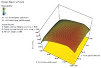 Five parameters were selected as main variables for the tableting process. The first was turret speed, for which a limit of 20,000–70,000 tablets/h was set. The turret speed, normally converted from tablets/h to rpm, is simply the rotational speed of the circular table in which the tablet die sits. Increases in speed increase the production rate.