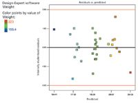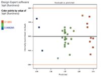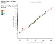 A residuals versus predicted plot was constructed to look for trends in the data (see Figure 6). All data points are equally distributed and are within two standard deviations from the mean, with two exceptions. One high point is 2.422 standard deviations, and one low point is –2.473 standard deviations). The two data points that lie beyond 2 standard deviations of the mean could be investigated, and these experiments may warrant being rerun to confirm the data response. The data have no potential outliers.