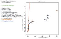 The 95% confidence intervals for all significant factors were verified to exclude zero, which supports the determination that all identified terms in the model equation influence the response. A normal plot of residuals was constructed to determine whether residuals followed a normal distribution (see Figure 2). A plot of residuals versus predicted was constructed to discover convincing trends to the residuals or suspected outliers in the data (see Figure 3). All data points are equally distributed and are within two standard deviations from the mean with two exceptions: one high point is 2.206 standard devations, and one low point is –2.312 standard deviations. The two data points that lie beyond two standard deviations of the mean could be investigated, and these experiments may warrant being rerun to confirm the data response. The data showed no potential outliers.