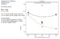 Plots were generated for the interactions of CD and CE. These plots are included in the appendix of supporting figures. The 3D-contour CD interaction plot is shaped like a spade because of the data collected during the centerpoint experimental runs. The interaction plot shows that tablet hardness increased as main compression and precompression heights were reduced (see Appendix Figures 1 and 2). This makes logical sense because when the compression rollers are pulled close together, high compression forces are imposed on the tablet, thus resulting in hard tablets. Both 3D plots and standard interaction plots support this analysis.