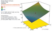 The third variable was tablet-cylinder height during precompression, for which limits of 2–4 mm were set. This variable represents how low the compression roller is set to force the tablet punches through the precompression zone to tamp down the powder and compact the blend slightly before main compression occurs. Large numbers indicate that less force is applied to the powder. Tablet-cylinder height is often converted into a force measured in kilonewtons. Small values typically result in hard, thin tablets, assuming that the amount of powder fill is constant. The purpose of precompression is to remove entrapped air from the filled tablet-die cavity. This task aids the main compression step in producing a robust tablet.