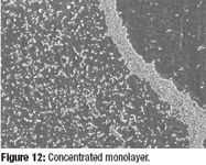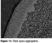 The edge effect may consist of only a densely packed monolayer of spores (see Figure 11) or it may result in multiple layers of densely packed spores (see Figure 12). The difference may influence BI resistance depending on the sterilization process. The survivor kinetics of spores exposed to low-pressure plasma by Hury et al. demonstrated that D-values vary when one decreases the surface density of spores (7). Hury suggested that the diffusion of the sterilant was limited by a "shield effect" of stacked spores.