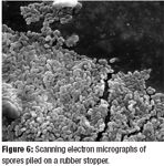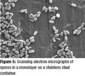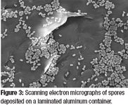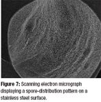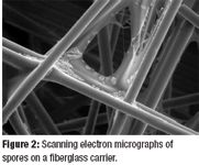 The spores can be distributed on the carrier in many forms, ranging from a well-dispersed monolayer to large aggregates, as demonstrated in Figures 5 and 6, respectively. Spore aggregates can be problematic depending on the sterilization process. The protection of spores in the center of these aggregates can lead to a perceived increased resistance and erratic results (tailing), which are experimental artifacts. Aggregates can be minimized by understanding the surface characteristics of the carrier and selecting an appropriate carrier liquid and spore population.
