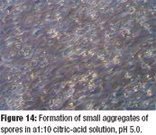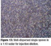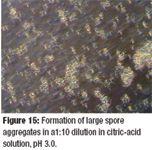 Liquid-carrier BIs generally consist of hermetically sealed glass ampuls filled with the inoculated liquid, which usually is a culture medium. The physical and chemical properties of the liquid influence spore resistance. Properties such as pH, ionic strength, the concentration of active ingredients, and the viscosity of these liquids can cause spores to clump. Spore clumping may lead to erratic results and higher resistance. The effect of pH is demonstrated by phase-contrast microscopy in Figures 13–15. Changes in the pH of some liqu-ids may cause spores to form aggregates. As the pH shifts from neutral to acidic, the spores may form larger aggregates. The size of the aggregates can protect spores in the center of these clusters, which results in a higher observed resistance. This resistance cannot be considered an artifact of experimental error because the chemistry of the liquid has a similar effect on the bioburden that naturally occurs in the product.