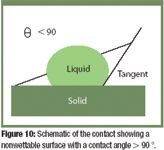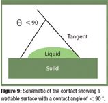 The wettablity of the surface by the selected carriers is measured by the critical-contact angle of the carrier (see Figure 9). The lower the critical-contact angle, the more wettable the surface. Wettable surfaces result in more uniform spore distribution on the carrier.