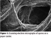 Spores are inoculated onto solid carriers by dispensing a specified volume of a calibrated spore suspension onto the carrier. If the carrier is fibrous, the spores will be wicked throughout the depth of the carrier. Figures 1 and 2 display spore placement on two different fibrous carriers.