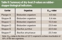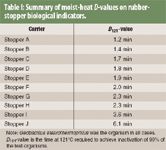 Table I: Summary of moist-heat D-values on rubber-stopper biological indicators.