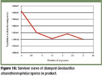 A survivor-curve test performed on clumped spores in a pharmaceutical product resulted in a rapid drop in population during the initial phase (i.e., the death of single spores or small clumps), followed by tailing because of the presence of large clumps of spores. (see Figure 16). Data such as these initially may seem troublesome, but they are critical when developing a product-sterilization cycle.