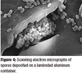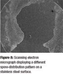 If the carrier is a nonfibrous solid, the spores will be deposited on a single plane of the carrier. Spores placed onto surfaces that are not perfectly smooth may settle in locations that prove difficult to sterilize, as demonstrated in Figures 3 and 4. Additionally, the surface quality of a carrier can affect BI resistance. Sigworth and Stark demonstrated that anodized aluminum with good surface quality resulted in much lower D-values (H2O2 sterilization) than other aluminum carriers (2). Several nonaluminum carriers with rough surfaces resulted in "acceptable" D-values, while other carriers with smooth surfaces showed increased resistance. These tests emphasized that a combination of carrier properties influence BI resistance, not a single carrier property.