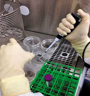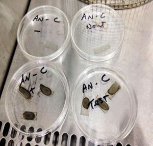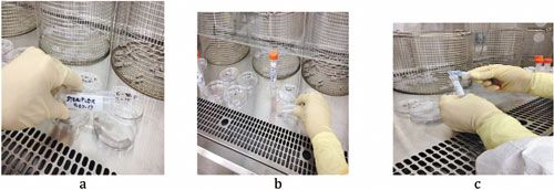 As shown in Figure 1, 100 μL of the challenge organism suspension was dispersed onto each of the positive control carriers and each of the test carriers. The suspension was spread evenly on the carriers and air dried in the biosafety cabinet; petri dish covers were left off in the cabinet (see Figure 2).