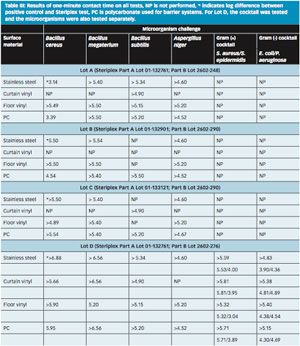 Hands-on aseptic processing training is offered at the Aseptic Training Institute (ATI) in Clayton, NC. During courses in 2012 and 2013, in-situ evaluations were performed using Steriplex. The ATI facility is a soft-wall cleanroom, approximately 450 ft2 in space. Specific Bacillus spores were intentionally used to contaminate surfaces, materials, and operator’s sterile gloves during media fills performed in the cleanroom at the facility. To evaluate the effectiveness of Steriplex in situ after the facility and equipment had been contaminated and subsequently cleaned with a detergent solution, environmental samples from surfaces of equipment and the facility were collected. The facility and equipment were then sanitized once with Steriplex SD and sampled again. The results are shown in Table IV. The in-situ testing has been performed three times with similar results.
