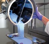 An operator at Flamel Technologies empties Micropump coated multiparticulates from a fluid bed onto a tray. (IMAGE IS COURTESY OF FLAMEL TECHNOLOGIES)