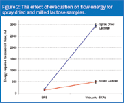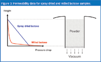Characterisation data for two forms of lactose allow comparative predictions of their inprocess behaviour for this application (Figure 1 and Figure 2). These data allow comparative predictions of the in-process behaviour of the two forms of lactose, for this application. The spray dried lactose is more heavily influenced by the application of a vacuum than the milled alternative, with flow energy rising to a much higher level. The permeability data (Figure 3) suggest why. The spray dried lactose bed is relatively porous so an applied vacuum induces a uniform pressure drop across the full height of the sample. With the less porous milled lactose, the pressure drop is concentrated near the vacuum's source. In both, the pressure drop is similar, but has different effects on the powder bulk. The flow energy of the spray dried lactose increases more markedly because the vacuum acts on the entire bed. With the milled lactose only a portion of the bed is affected, making the rise in flow energy more modest.