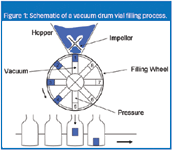 Consider the process of vacuum drum vial filling used to produce pre-metered powdered doses for in situ reconstitution for intravenous delivery (Figure 1). Powder is transferred from the hopper under vacuum into the port at position 1. The vacuum draws powder into the die and keeps it there as the drum rotates to bring the filled port directly above the vial. Then, the powder plug is ejected using positive pressure and the filled vial passes down the line for sealing.