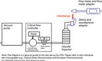 Figure 1 shows a typical pharmacopeial cascade impactor setup for dry-powder inhaler (DPI) testing that includes a number of essential ancillaries. The device is interfaced to the cascade impactor using an appropriate mouthpiece adapter and an induction port. Flow rate through the cascade impactor is controlled by the critical flow controller/flow meter, and a vacuum pump draws air through the whole system.