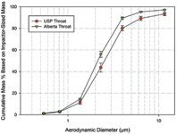 Figure 2: For this pressurized metered-dose inhaler, use of the Alberta Idealized Throat shifts the measured, cumulative, aerodynamic particle size distribution to finer size distributions relative to the standard United States Pharmacopeia (USP) induction port.