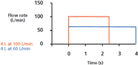 Pharmacopeial monographs for testing DPIs specify the application of a flow rate that results in a pressure drop of 4 kPa across the device, which is considered broadly representative of an adult patient's inhalation strength. DPIs vary considerably in terms of flow resistance so, in practice, test flow rates span a broad range of values, from around 30–40 L/min for a high resistance device up to the imposed limit of 100 L/min for those with much lower resistance. The defined flow rate is applied for the time taken to draw 4 L of air through the device if following pharmacopeial specifications or 2 L if following FDA guidance, in the form of a square wave profile (see Figure 3).