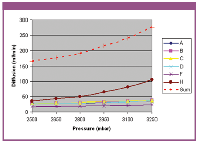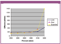 The multipoint diffusion limit curve is based on the diffusive flow and the bulk flow and is defined by three set points. It is a straight line from the first test pressure point, which is the common single-point diffusion-test pressure (in this case 2500 mbar or 36.25 psi), up to a point at 100 mbar before the minimum bubble point (in this case 3100 mbar or 44.95 psi). The last point at 50 mbar after the minimum bubble point (in this case 3250 mbar or 47.15 psi). This much higher maximum allowable diffusion rate allows one cartridge to reach the bubble point at the minimum bubble point without giving a false failed test result (see Figure 5).