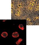 Fluorescence-dye solution (above) and microscopy imaging (left) of fluorescence-labeled pulmonary "CaP" insulin parti-cles from BioSante. (PHOTOS COURTESY OF BIOSANTE PHARMACEUTICALS)
