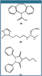 Figure 2: Molecular structures of (a) carbamazepine (5H-dibenze[b,f]azepine-5-carboxamide), (b) cimetidine (N"-cyano-N-methyl-N'-[2-[[5-methyl-1H-imidazol-4-yl]methyl]thio]-ethyl]-guanidine), and (c) phenylbutazone (1,2-diphenyl-4-n-butyl-3,5-pyrazolidinedione).