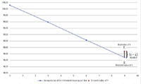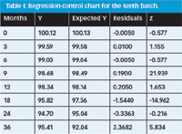 Regression-control-chart-method. The regression-control-chart method is used to compare the results within the batch and detect present OOT results. For the purpose of this method, the tenth batch was examined. Several least-square regression lines were fit to the suitable data (5). The first regression line was constructed from the three results for assay at the first three time points (0, 3, and 6 months). With extrapolation of that regression line, the expected values for Y and the Y residuals were calculated (see Figure 1) (6). The procedure was then repeated by gradually adding all the other consecutive time points.