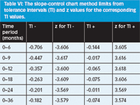 Table VI: The slope-control chart method limits from tolerance intervals (TI) and z values for the corresponding TI values.