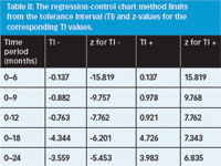 Table II: The regression-control chart method limits from the tolerance interval (TI) and z-values for the corresponding TI values.