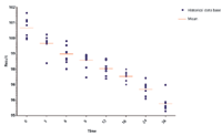 By-time-point method. The by-time-point method is used to determine whether a result is within expectations on the basis of experiences from other batches measured at the same stability time point. To minimize the α and β error (6), batches that comprise the historical data (Batches 1 to 9) were individually tested for present OOT results. In addition, calculations for the mean and standard deviation of the values for the tested attribute were made from the historical data for each time point individually (see Figure 2).