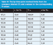 Table IV: The by-time-point method limits from the tolerance interval (TI) and z-values for the corresponding TI values.