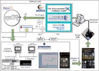 As an example, consider integration of control hardware and software in the continuous feeder and blender system, as shown in Figure 2. A PAT system is used to read the near infrared (NIR) spectral data at the blender outlet and communicate it to the multivariable analysis (MVA) model performing principle-component analysis and partial least-squares (PCA/PLS) to provide the API concentration and relative standard deviation (RSD) value. These critical quality attributes (CQAs) are used as inputs to the MPC in the process-control system. The MPC uses the two CQA inputs to drive the feed ratio and the blender speed. The MPC output (feed ratio) gives the feeders' flowrate setpoints, which are then tracked by slave PID controllers. The implemented control scheme utilises a PAT data-management system (synTQ, Optimal) to integrate a digital automation system (DeltaV, Emerson Process Management) with an NIR analyser and MVA model.